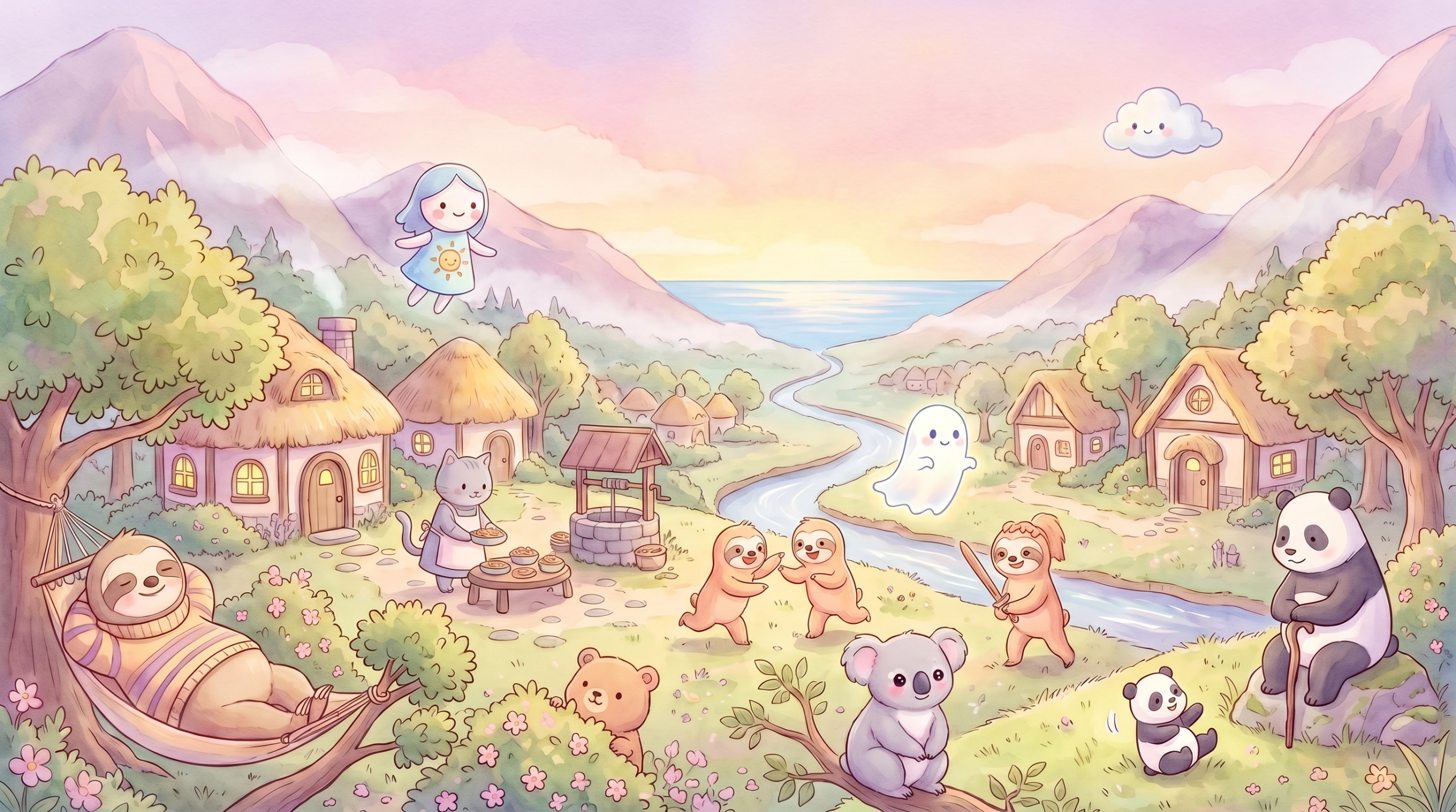 這時,天空飄過了一朵小小的雲——那是傻雲。他安靜地俯瞰著地上的熱鬧場景,雖然沒有加入,但從他輕輕變換的雲朵形狀來看,似乎也覺得今天的樹獺村非常有趣。